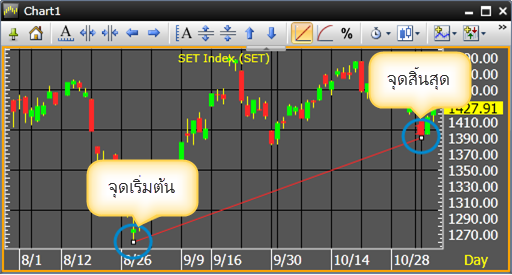 Trend Line โดยคลิกเมาส์ค้างที่จุดเริ่มต้นแล้วลากเมาส์ไปยังจุดปลายสุดที่ต้องการ